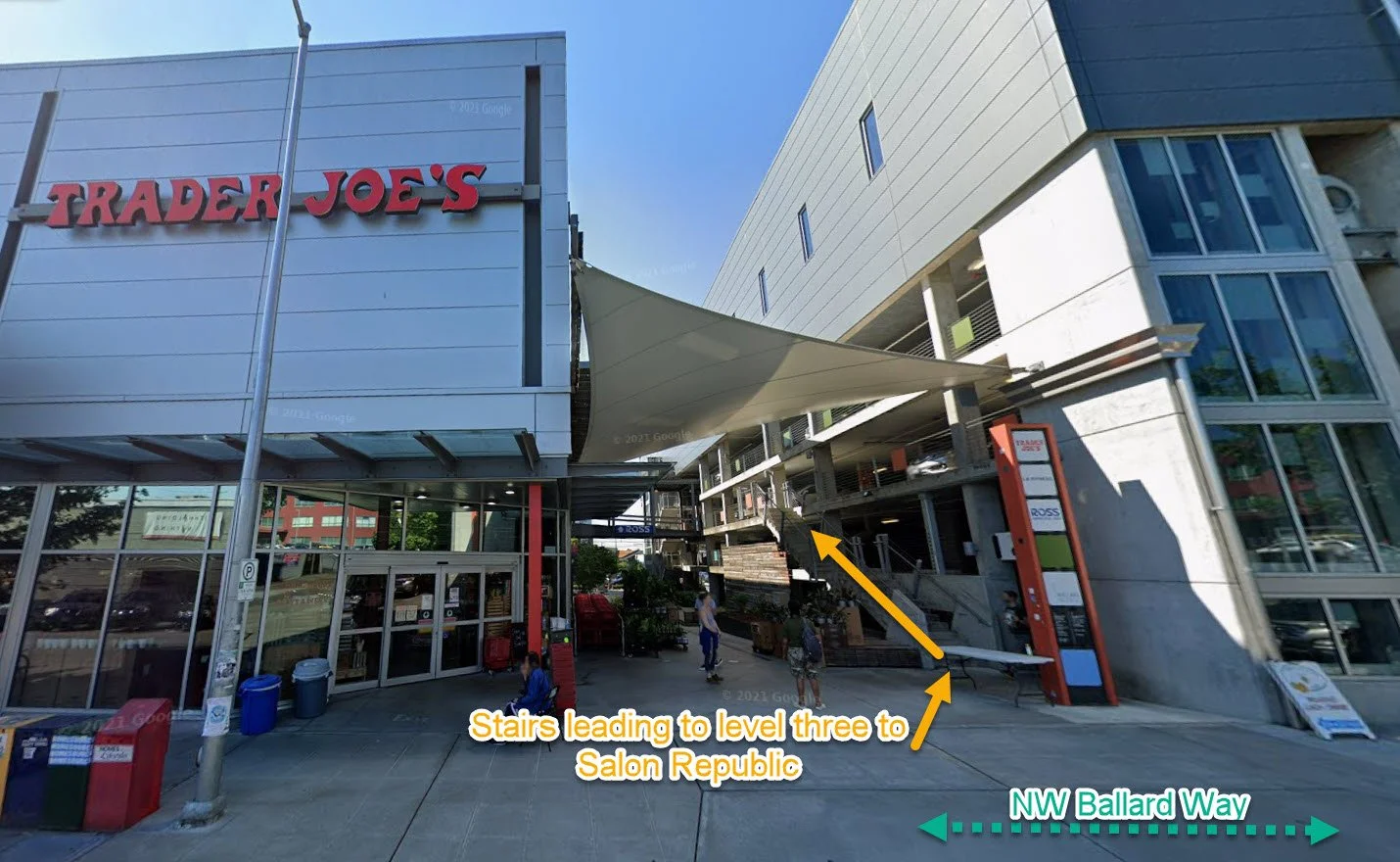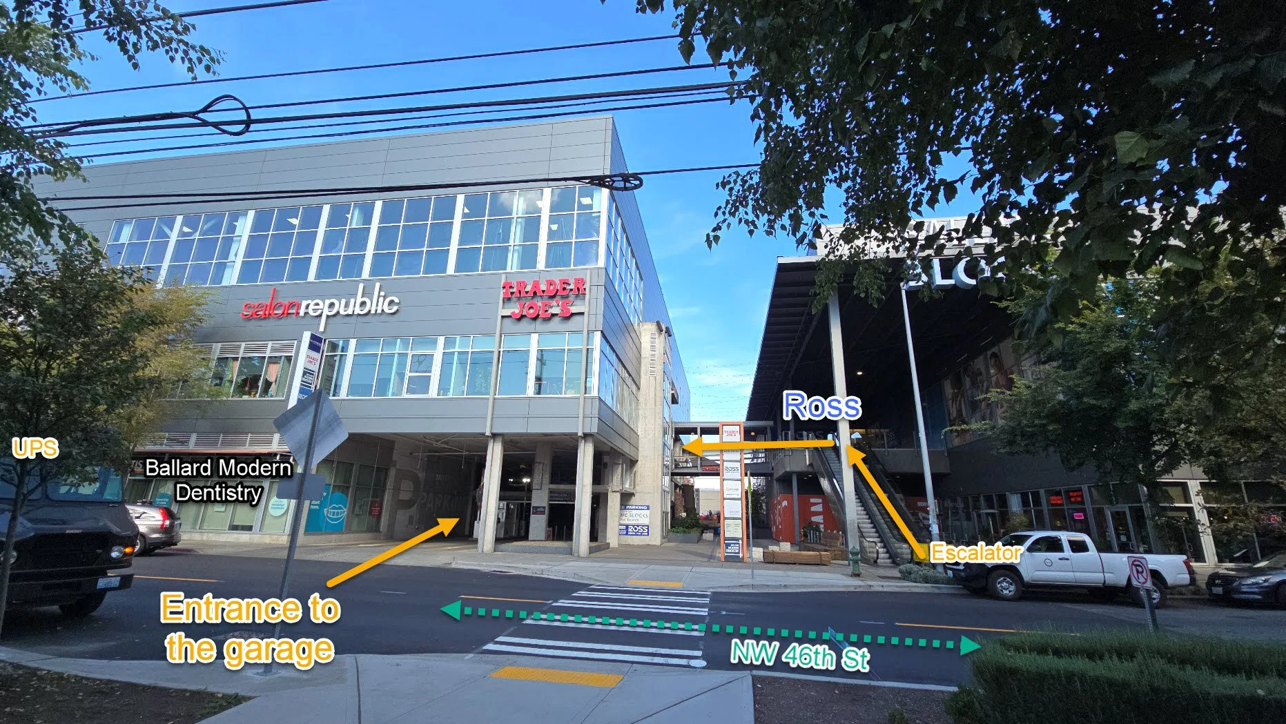 The location looks like a parking building. You can enter the building from both sides: NW 46th St and NW Ballard Way, either by car or walking.